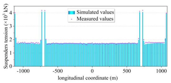 The distribution of suspender forces is shown in Figure 11. As mentioned in Section 4.1, the existence of displacement-limiting suspenders on both side spans of the Nanjing Qixiashan Yangtze River Bridge makes the cable force assignment relatively special. From the results of iterative calculations of the reasonable state, the displacement-limiting suspender force of the south and north spans reached 3875.85 kN and 3912.02 kN, respectively. The special suspender forces on the left and right sides of the north and south pylons reached 4069.33 kN and 4058.83 kN. These groups of suspenders have essentially twice the force of the rest of the suspenders. In addition, the adjacent suspenders of the above groups of suspenders also have a slightly higher tension than the other suspenders. The rest of the general locations have a more even distribution of suspender tension of about 1730 kN. Similarly, a comparative analysis was conducted between the simulated cable tension and the measured values from the load test. It is evident that the disparity between the two is negligible, both falling within a margin of 0.5%.