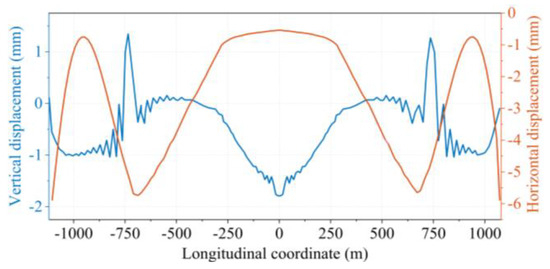 In common engineering practices, displacement is generally measured by the deviation between a reasonable state obtained from iterative calculations and a desired position obtained through nonlinear finite element analysis. The determined state is reasonable when the deformations of all units obtained from the calculations are within the specified tolerances [27]. The displacement deviations obtained for the girder at a reasonable state are shown in Figure 12. The maximum vertical displacement of the girder is close to 2 mm, and the maximum lateral displacement is about 6 mm. It is shown that the dead load displacements are comparatively low, and the structure is able to reach the designed bridge condition under this set of suspender forces. The state found by the algorithm is very close to the ideal position in normal engineering practice. This fact verifies the accuracy and effectiveness of the proposed algorithm.