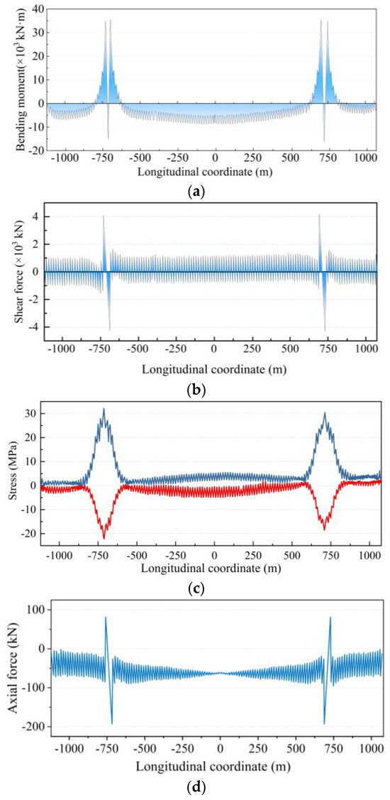 Internal force diagram of girder under the reasonable state: (a) the bending moment of the girder; (b) the shear force of the girder; (c) the stresses of the girder and (d) the axial force of the girder.