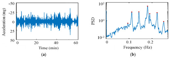 Time and frequency domain analysis of typical acceleration samples based on field monitoring (a) time history curve and (b) PSD.