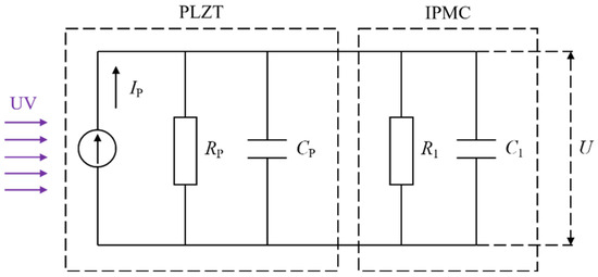 When PLZT ceramic is illuminated by a UV light source, a photovoltaic voltage is generated at both ends of the electrode. For the electrical model of the PLZT ceramic, it can be thought of as an equivalent circuit composed of a constant current source, with resistor Rp and capacitor Cp in parallel [20], and the photovoltage of this equivalent circuit model is: