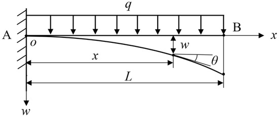 When PLZT ceramic is illuminated by a high energy UV light source, the photovoltaic voltage is generated to drive the IPMC load mechanism and the driving force is produced in the IPMC as well as a continuous distribution of loads along the thickness of the polymer layer. Therefore, the IPMC load mechanism is simplified and can be regarded as a cantilever beam with one end fixed. The cantilever beam bears a uniform load, and the force direction is perpendicular to the plate direction. L is the length of cantilever beam AB, q is the distributed force and θ is the angle of torsion. The specific mechanical simplification is shown in Figure 2.