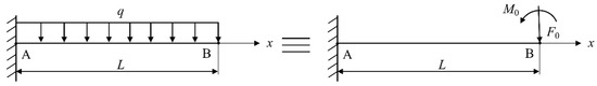 The cantilever beam model subjected to a uniform load can be further simplified to a cantilever beam model, subjected to tip load F0 and bending moment M0 at the free end, as shown in Figure 3 below.