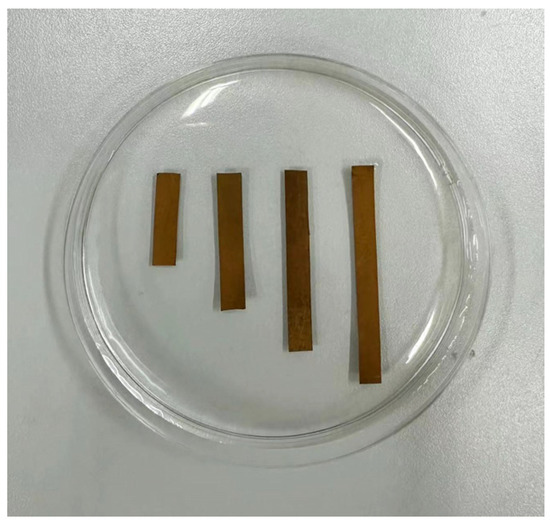 In order to verify the feasibility of an IPMC optical-controlled flexible driving method based on PLZT ceramic, a series of driving performances of IPMC under a direct current and light excitation were carried out. With different IPMC sizes, the input voltage and the light intensity as variables, the variation trend of the IPMC output deformation was measured. In this article, the metal electrode layer of the IPMC was Pt, the surface resistance of the material was small, and the property was stable. IPMC lengths of 20 mm, 30 mm, 40 mm and 50 mm were selected, respectively, and were named 20-IPMC, 30-IPMC and so on, according to their length. The width was 5 mm and the thickness was 0.2 mm, as shown in Figure 4.