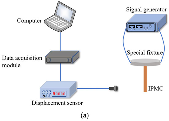 One end of the IPMC is fixed onto the special fixture. The signal generator, respectively, outputs 1~4 V direct current (node is 0.5 V), which is the input voltage of the IPMC driving; the output deformation is monitored in real time by the micro laser displacement sensor, collected and uploaded to the PC by the data acquisition module. After each test is completed, the IPMC is placed in pure water for 5~10 min to avoid long-term water loss affecting the next test.