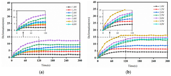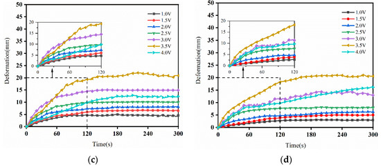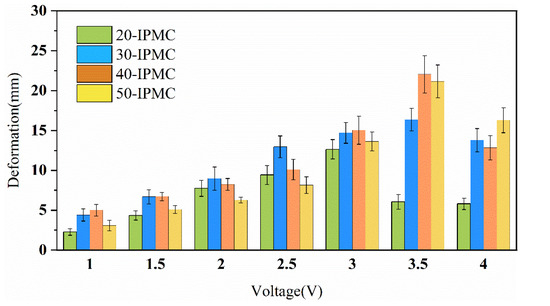 Figure 6 shows the deformation curves of the IPMC under different voltages. Figure 6a shows the deformation curve of 20-IPMC: when the input voltage was 1–3 V, the deformation increased with the increasing voltage; when the voltage was 3 V, its deformation reached the maximum. Figure 5b–d shows the deformation curves of 30-IPMC, 40-IPMC and 50-IPMC: when the input voltage was 1–3.5 V, the deformation of IPMC increased with increases in the voltage, and the deformation reached the largest value when the voltage was 3.5 V.
