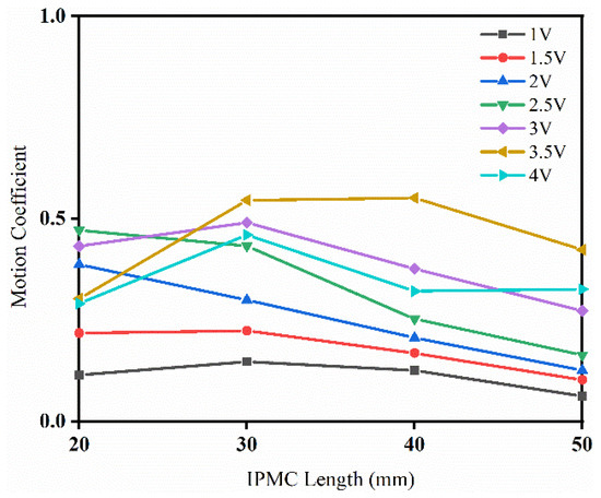 However, for IPMC flexible driving, its deformation is closely related to the length of the material; that is, an IPMC with a large length has a large curvature radius, and its output deformation must be large. Therefore, simply discussing the maximum deformation cannot accurately reflect the driving ability of the IPMC. To evaluate the driving performance of the IPMC more accurately, the ratio of the maximum deformation to the material length is defined as the motion coefficient. Under the excitation of different voltages, the calculation results of IPMC motion coefficients of different lengths are drawn as in Figure 8.