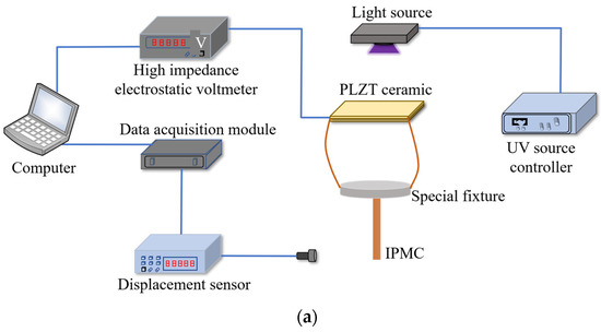 The UV light source controller controls the high-energy UV light source to irradiate vertically and uniformly on the PLZT ceramic surface, which is connected to the high-impedance voltmeter sensor probe via a silver wire; the voltage data received by the sensor probe is transmitted to the high-impedance voltmeter controller and finally to the PC. Meanwhile, the output deformation signal of the IPMC is collected and transmitted to the computer. The size parameters of the PLZT ceramic are 10 mm × 5 mm × 0.8 mm (length × width × thickness). Similarly, after each test is completed, the IPMC is placed in pure water for 5–10 min to avoid long-term water loss.