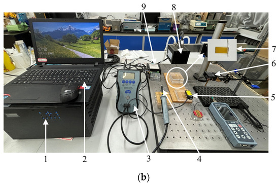 Diagram of the optical-controlled driving experimental setup. (a) Experimental schematic diagram. (b) The experimental test platform. (1) UV source controller, (2) Computer, (3) High-impedance electrostatic voltmeter, (4) Sensor head of high-impedance voltmeter, (5) Displacement sensor, (6) Special fixture, (7) PLZT ceramic, (8) Light source, (9) Data acquisition module.