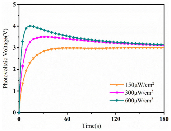 Light intensities of 150 μW/cm2, 300 μW/cm2 and 600 μW/cm2 were applied, Figure 10 shows the photovoltaic voltage curves of the PLZT ceramic under different selected light intensities. Under the light excitation, the photovoltaic voltage generated by the PLZT ceramic quickly rose to a saturated state, and then maintained a stable state. The saturation value of the photovoltaic voltage gradually increased with increases in the light intensity, the response speed also increased, and the time required to reach the saturation value decreased.
