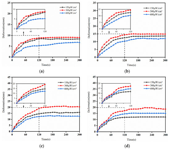 The deformation curves of the IPMC under different light intensities: (a) 20-IPMC, (b) 30-IPMC, (c) 40-IPMC, (d) 50-IPMC.