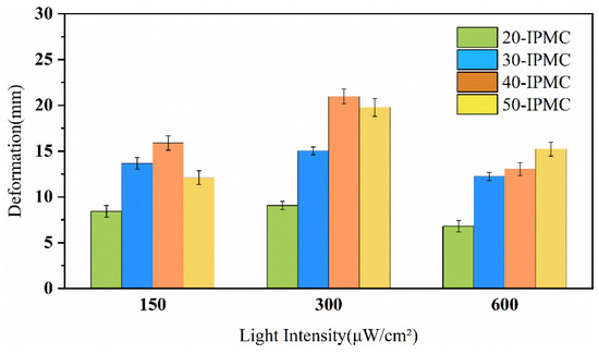 Comparison of the maximum deformation of the IPMC under different light intensities.