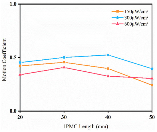 From Figure 12, it is obvious that all the IPMCs showed a similar dependence on the applied light intensity amplitude; that is, the driving voltage increased when the input light intensity increased, and the deformation also increased, and finally reached a stable state. In addition, when the light intensity was 300 μW/cm2, the 40-IPMC showed the greatest deformation compared to other sizes of IPMC. Similarly, the motion coefficient of IPMC under different light intensities are drawn as Figure 13.