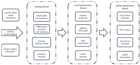 The overall system framework is illustrated in Figure 1. The perception system for the wheeled mobile robot consists primarily of three threads: tracking, local optimization, and global optimization.