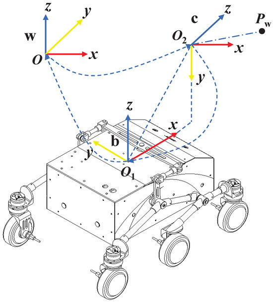 As shown in Figure 2, the perception problem for wheeled mobile robots primarily involves three coordinate systems: the world coordinate system w, the robot coordinate system b, and the camera coordinate system c. The robot coordinate system can be any frame of reference fixed to the robot body, but in this context, it is defined as the odometry coordinate system. The origin, , is located at the midpoint of the line connecting the wheel axes, with the positive x-axis pointing in the forward direction of the robot. The y-axis is aligned with the wheel axis line and positive to the left, while the positive z-axis points vertically upward from the origin. The camera coordinate system is centered at the camera’s optical center , with the positive z-axis pointing outwards from the camera lens, and the x and y axes aligned with the u and v directions of the pixel plane, respectively.
