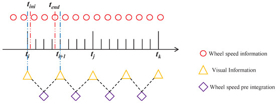 In wheeled mobile robots, encoder information is typically generated at a higher frequency than visual data, resulting in each frame of visual data corresponding to multiple instances of encoder data. Consequently, updating the camera pose at each iteration of back-end optimization, alongside the robot poses represented by the multiple sets of encoder data, can either lead to redundant computations or affect the accuracy of perception. Therefore, the concept of pre-integration is employed [25], as shown in Figure 4, to construct constraints between frames of visual information using pre-integrated encoder data.