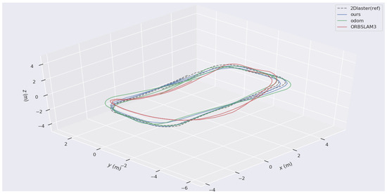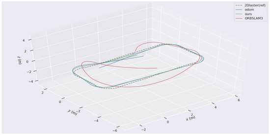 The trajectory obtained by Laser HectorSLAM is considered the ground truth. The trajectories of the proposed W-VSLAM method, the latest visual open-source algorithm ORBSLAM3 keyframe trajectory, and the robot’s odometry trajectory were compared. The trajectory comparisons for the two sets of experiments are shown in Figure 9 and Figure 10. Given the inconsistency in time frequencies across the different trajectories, the maximum time error is set at 0.01 s. Additionally, due to the external parameter transformation between different sensors, the results were aligned using the visualization tool.