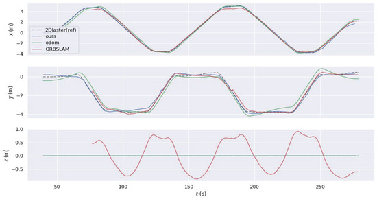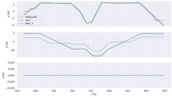 In the aforementioned corridor environment, we operated HectorSLAM using a 2D LiDAR with a scan range parameter set to 5 m. The resulting trajectory was compared with the trajectories obtained using the proposed algorithm and ORBSLAM3. The visual comparisons of the trajectories are illustrated in Figure 16 and Figure 17. Based on the conclusions from the quantitative accuracy comparison in the previous subsection, the trajectory from the wheel speed odometer was neither included in the comparison nor reported. Observing the trajectory obtained by HectorSLAM with a 5 m detection range, it is evident that when the sensor’s detection distance is insufficient to cover the corridor length, the trajectory generated by HectorSLAM becomes distorted. This distortion occurs because the point cloud observations within the detection range do not change as the robot moves through the corridor, leading to a lack of translational estimation (in the y-axis direction in the world coordinate system). In contrast, the proposed algorithm can still accurately perceive the environment in the long corridor, demonstrating the advantages of visual SLAM methods in specific settings. Additionally, as seen in the translational component comparison in Figure 17, the trajectory obtained by ORBSLAM3 is generally accurate in the r-axis direction (perpendicular to the corridor direction), except at the end of the trajectory. The proposed algorithm’s trajectory closely aligns with the reference trajectory, except for a noticeable deviation at the trajectory’s end due to visual odometry estimation errors. The trajectory generated by the proposed method is closer to the actual path, further showcasing its advantages in environments where LiDAR fails.