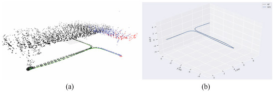 (a) Perception results of robot poses and map points in Experiment Two. (b) Comparison between Experiment Two and reference trajectory.