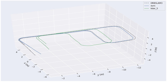 In Experiment Two, as shown in Table 4, the root mean square error in translation estimation was 0.160804 m, while the root mean square error in rotation estimation was 0.101190 rad. In horizontal comparisons, the proposed algorithm outperformed the other two algorithms, demonstrating its ability to integrate two relatively imprecise sensor data streams to achieve more accurate pose estimation and validate the effectiveness of the algorithm.