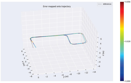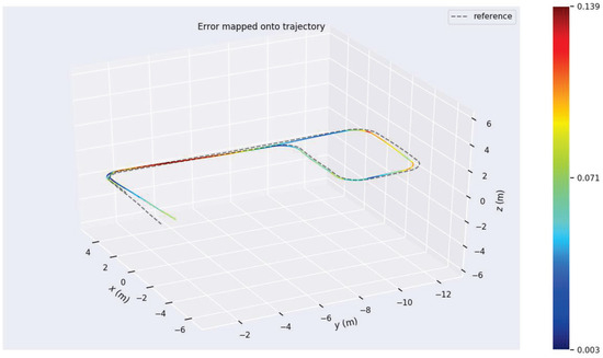 Absolute trajectory error reflects the algorithm’s accuracy over the entire trajectory. In Experiment One, as shown in Table 2, the proposed algorithm achieved a root mean square error of 0.135999 m in the translation direction, which is significantly better than the other two algorithms. The root mean square error in rotation estimation was 0.024885 rad, also outperforming the other two algorithms.