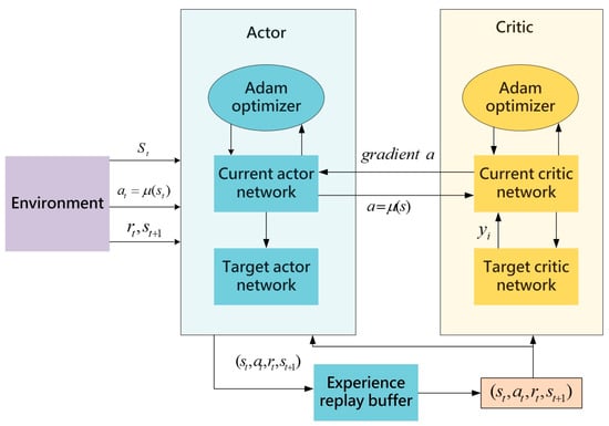 The Deep Deterministic Policy Gradient (DDPG) algorithm [20] combines the advantages of the Deep Q-Network (DQN) [18] and the actor–critic structure to achieve efficient learning and decision-making in continuous action spaces. The DDPG algorithm utilizes an actor–critic framework, in which the actor network takes the current state as input and outputs a deterministic action. This deterministic action generation allows for precise decision-making in continuous action spaces, while the critic network evaluates these actions by inputting state–action pairs and outputting corresponding Q-values. The dual-network structure effectively facilitates policy generation and value evaluation, enabling DDPG to excel in complex continuous action spaces. To enhance training stability, the DDPG algorithm introduces a replay buffer to store interaction experiences with the environment. During training, random sampling from the replay buffer breaks correlation between samples, reduces the impact of non-stationary data on the training process, and improves overall training stability. In addition, DDPG incorporates target networks, which are delayed-update copies of the actor and critic networks. The target networks aim to mitigate rapid changes in value estimates that may destabilize the training process. The slower parameter updates of the target networks provide a more stable learning target, further enhancing the stability of the training process. During training, the agent continuously interacts with the environment, accumulating experiences and storing them in the replay buffer. The algorithm periodically samples experiences from the buffer to train and update the parameters of the actor and critic networks. Serving as delayed-update copies of these networks, the target networks offer a relatively stable learning target, effectively preventing rapid changes in value estimates and improving overall stability and efficiency during training. The architectural diagram of this algorithm is depicted in Figure 1: