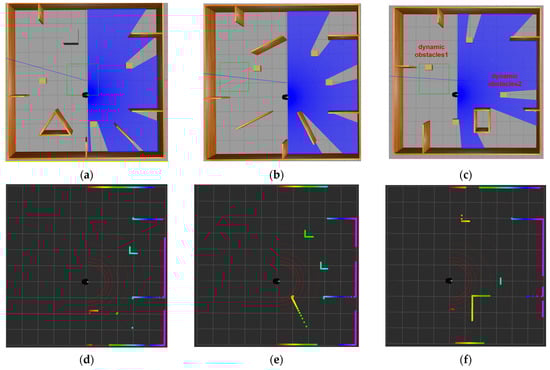 Simulation training environment (a) static simulation environment 1; (b) static simulation environment 2; (c) dynamic simulation environment; (d) visualization of static simulation environment 1 in Rviz; (e) visualization of static simulation environment 2 in Rviz; (f) visualization of the dynamic obstacle environment in Rviz.