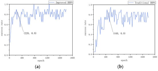 Firstly, from the perspective of success rate, Figure 5a,b show the change in success rate of the two algorithms in the dynamic obstacle environment. The improved DDPG algorithm shows a high success rate during training, reaching 90% or more several times and stabilizing at around 65%. This indicates that the improved algorithm is able to effectively adapt and navigate in the dynamic obstacle environment and exhibits strong generalization ability and robustness. In contrast, the traditional DDPG algorithm’s success rate decreases gradually during training, dropping to 0 at around 250 and rising to 20% at around 300. This significant difference indicates that the traditional algorithm has poor adaptability in the face of dynamic obstacles, while the improved algorithm can quickly adapt to environmental changes and maintain a high success rate.