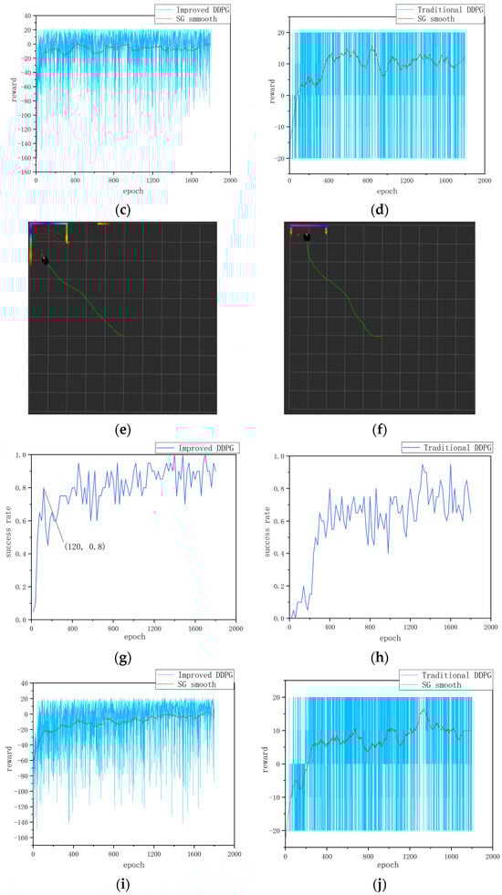 Figure 4g–l show the experimental data in environment 2. First, as shown in Figure 4g,h the path planning success rate trends in a static obstacle environment for two algorithms are illustrated. From Figure 4g,h it can be seen that the success rate of the traditional DDPG algorithm reaches 80% at the 400th round, after which it fluctuates significantly, hovering between 40% and 80%, and finally stabilizes at around 65%, indicating its uncertainty and adaptability limitations in path planning. In contrast, the improved DDPG algorithm reaches an 80% success rate at the 120th round and maintains around 85% throughout the training cycle, with a maximum success rate reaching 100%. Compared with the traditional DDPG algorithm, the stability of the success rate of the improved algorithm increases by 20%; the results demonstrate improvements on the DDPG’s learning efficiency and strategy robustness. Second, as shown in Figure 4i,j the cumulative reward value per round further reflects the algorithm’s performance. The improved DDPG algorithm maintains an overall high and stable level of cumulative rewards with less volatility, demonstrating more stable path planning and obstacle avoidance performance. In contrast, the cumulative reward of the traditional DDPG algorithm is more volatile, oscillating between 20 and −20. This large volatility reflects the instability of the traditional algorithm in complex environments and the importance of reward function design for path planning and obstacle avoidance. Finally, as shown in Figure 4k,l the cumulative number of steps per round further verifies the efficiency of the improved algorithm. It can be seen that the number of steps with the improved algorithm per round gradually decreases, ultimately leading to a more efficient path planning strategy. Compared with the traditional algorithm, the number of steps taken by the improved algorithm to reach the target point is reduced by 25%, indicating that the improved algorithm continuously optimizes path selection during the iteration process, improving the efficiency and accuracy of path planning.