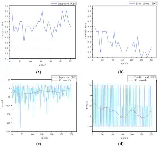 Dynamic obstacle training results: (a) success rate of the improved DDPG algorithm, (b) success rate of the traditional DDPG algorithm, (c) cumulative reward per round for the improved DDPG algorithm, and (d) cumulative reward per round for the traditional DDPG algorithm.
