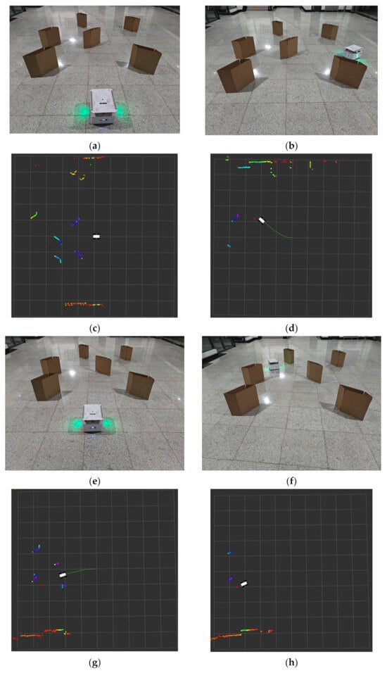 Figure 6a,b show the initial position of the mobile robot and the location of the target point it reaches, and Figure 6c,d demonstrate the visualization results via the Rviz tool. The colored portions shown as Figure 6a, b depict the obstacles identified by the radar on the robot; the small red dots represent the location of the target point, and the green line illustrates the cart’s trajectory, which, as evidenced in Figure 6d, successfully reached the target point. Furthermore, the robot trajectory is notably smooth, which indicates that the cart is capable of effectively recognizing obstacles and planning an optimal path to the target point. The second set of experiments provides further confirmation of the efficacy of the algorithm. Figure 6e,f also illustrate the initial position of the robot and the designated goal point. The Rviz visualization results in Figure 6g,h demonstrate the smoothness and directness of the robot’s trajectory, indicating that the robot selects the most direct path in approaching the goal point without detours.