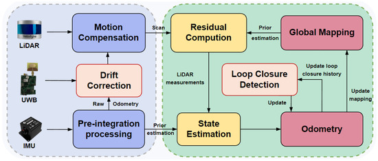 Our system employs inertial sensor measurements and LiDAR measurements as observations and utilizes IESKF for data fusion. To mitigate the inertial sensor’s initial bias and long-term drift, as well as to compensate for point cloud distortion caused by the high-speed LiDAR, we utilize UWB-ranging data to aid LiDAR motion compensation with minimal computational complexity. Additionally, we have integrated loop closure detection to achieve high-precision mapping in challenging environments, thereby enhancing system robustness and accuracy. Detailed explanations will be provided in the following sections.