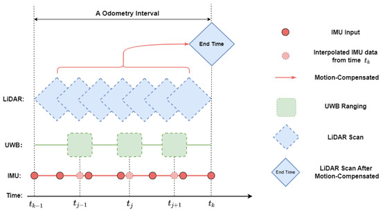The time synchronization of sensors within the system has been adapted from the time synchronization principles documented in [10], with a focus on LiDAR and IMU. Given the relatively lower frequency of UWB, it often necessitates the interpolation and adaptation of its data using the higher frequency IMU within scanning intervals, as depicted in Figure 2.
