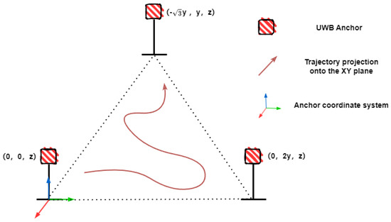 Due to the lack of standardized UWB ranging datasets, in M2DGR, we simulated UWB ranging information by adding Gaussian noise with a mean of zero and a standard deviation of 5cm to the ground truth ranging data [24,25]. In our subsequent real-world experiments, the UWB noise is also modeled as Gaussian noise with a mean of zero and a standard deviation of 5 cm. For calculating the coordinates of anchors in the anchor coordinate system, as shown in Figure 4, it only requires setting one anchor as the origin and another anchor on the y-axis. The coordinates of the third anchor in the anchor coordinate system can be calculated based on the relative distances between the three anchors. This design allows for the straightforward calculation of anchor coordinates within the anchor coordinate system. By using the IESKF to estimate the transformation from the world coordinate system to the anchor coordinate system, the coordinates of the anchors in the world coordinate system can be accurately and easily determined.