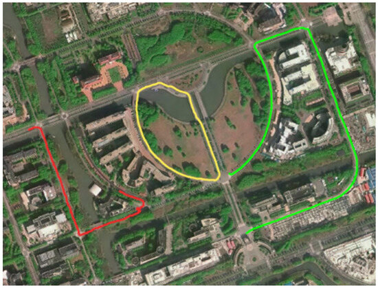 Trajectories of large-scale scene sequences on the map; with red representing the street_01 sequence, green representing the street_02 sequence, and yellow representing the street_04 sequence.
