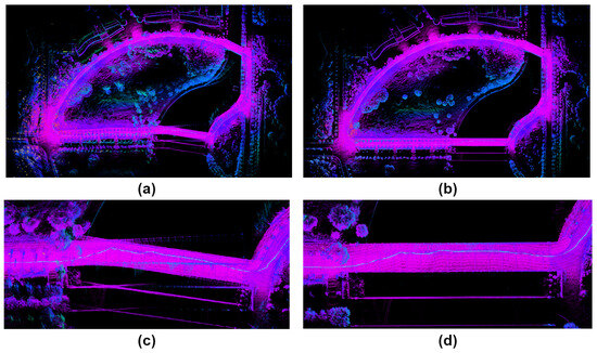 The data reveal significant drift in the street_01 sequence for LIO-SAM, attributable to back-end factor graph optimization difficulties when handling prolonged and extensive data. Likewise, due to motion compensation drift in FAST-LIO2’s LiDAR, errors in residual estimation between planes and points lead to substantial distortion. In street_04, A-LOAM and FAST-LIO2, which lack loop closure detection modules, both exhibit poor accuracy due to cumulative drift over extended durations. The distorted global map generated by FAST-LIO2 is shown in Figure 6a, while the global map after correction by our system is depicted in Figure 6b. Although LIO-SAM showcases superior accuracy among the three methods for comparison, our system, leveraging both ranging and loop closure constraints concurrently, achieves the highest level of accuracy.