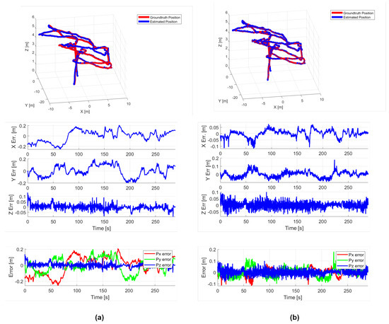 where represents the state variable that varies over time, , , and represent the inertial sensor’s displacement, velocity, and the Euler angles, respectively, and represent the biases of the inertial sensor’s angular and acceleration, respectively, while represents the unknown gravity vector in the kinematic model.