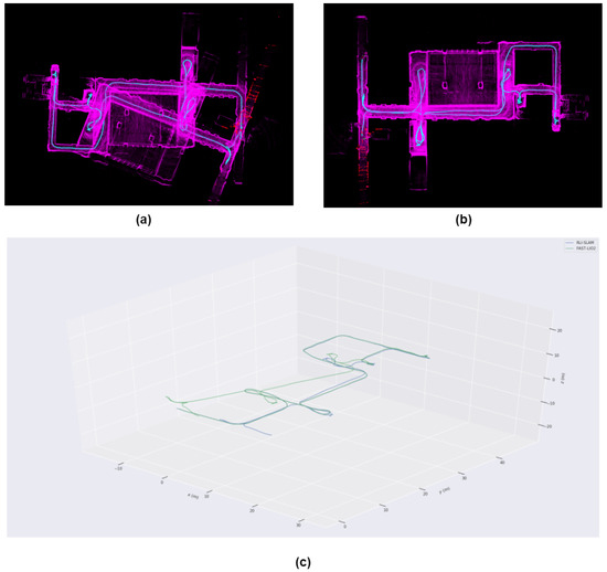 (a) Map constructed by FAST-LIO2 (b) Map constructed by RLI-SLAM (c) Trajectory plots of both methods.