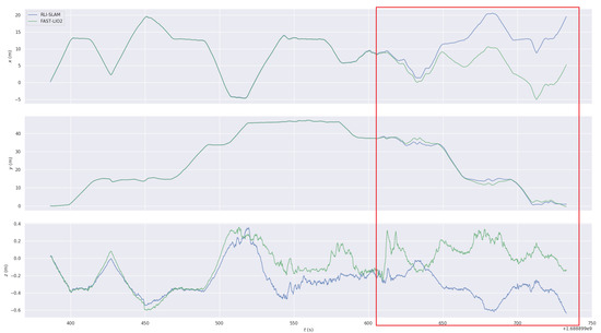 XYZ Components of Trajectory Estimation for FAST-LIO2 and RIL-SLAM.The red framed section indicates the part of the drift in FAST-LIO2.