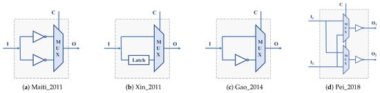 Configurable delay elements used in different RO-PUFs and implemented from the basic components of the CLBs: (a) Maiti et al. (2011) [33]. (b) Xin et al. (2011) [34]. (c) Gao et al. (2014) [35]. (d) Pei et al. (2018) [36].