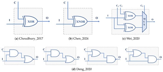 Describing the behavior of the delay elements of a configurable RO by linking it to the concept of PDL implemented through LUTs or defining it by a set of logical components that provide identical functionality implemented on the same LUTs is only a matter of interpretation. However, while the first approach is almost exclusively associated with the world of programmable devices, the second is also applicable to any of the application-specific integrated circuit (ASIC) manufacturing technologies. Multiplexers, such as those shown in the delay elements of Figure 2, are basic components that are usually present in the CLBs of the different families of FPGAs or whose functionality can be easily implemented in the LUTs of these devices. However, their implementation in ASICs is not very efficient, so different alternatives have been proposed to build and design PUFs whose implementation is efficient in both FPGAs and ASICs. Many of them are based on a cascade structure of 2-input XOR gates, so that one of these inputs determines whether the value of the other input or its negation is propagated to the output.