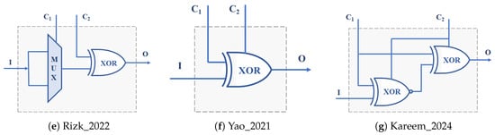 Configurable delay elements using logic gates for FPGA and ASIC implementation: (a) Choudhury et al. (2017) [45], Zhang et al. (2017) [46], and Liu et al. (2019) [47]. (b) Chen et al. (2024) [48]. (c) Wei et al. (2020) [49]. (d) Deng et al. (2020) [51]. (e) Rizk et al. (2022) [50]. (f) Yao et al. (2021) [53]. (g) Kareem et al. (2024) [54].