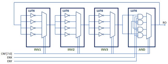 Figure 6 shows the schematic of a configurable RO formed by three inverter stages and an enable stage. Each of the inverter stages implements four inverters that share the same input and whose output is selected through the two control bits of a multiplexer. The last stage of the structure, which has two inputs to facilitate the row and column enablement of the elements of a RO bank, allows the closure of the RO feedback loop through four alternative paths selectable by two control bits. The entire structure can be replicated twice using the eight 6-input LUTs available in each CLB of Xilinx Series 7 devices. It is worth highlighting that the functionality of the multiplexers that appear in the figure is implemented in the LUT itself, without implying the need for additional logical or connection resources of the programmable device.