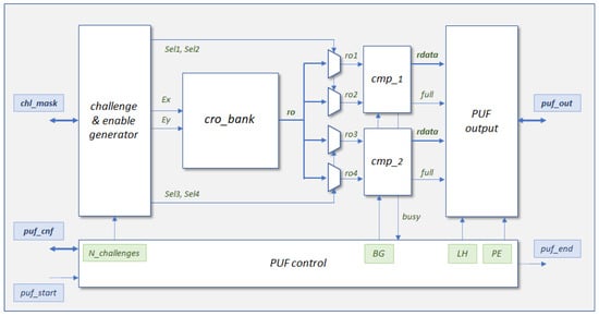 The main components of the PUF/TRNG are shown in the simplified block diagram in Figure 7. Once the start signal of the operation () is received by the core, the control block that orchestrates the entire operation of the module manages the block that generates the sequence of challenges () and enable signals () to select and activate, respectively, the two pairs of RO involved in each comparison cycle. When generating the challenge sequence, this block can discard the comparisons that most negatively affect the reliability of the module when acting as a PUF. This challenge selection mechanism is based on a selection mask obtained in an enrollment process prior to using the device.