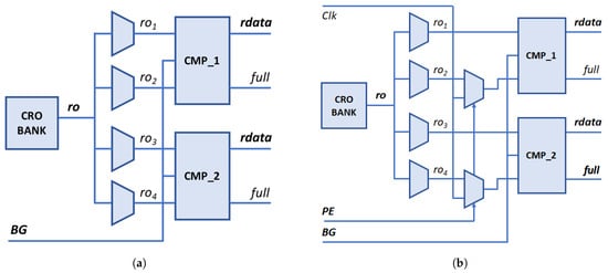 The size of the PUF therefore depends on the number of comparisons between ROs established by the challenge sequence and the number of bits obtained from each comparison ( and 1, respectively, in [9], N being the number of ROs). To increase the length of the PUF response, the number of comparisons can be increased to without compromising the correlation between the output bits [29]. The PUF output length for a given RO bank size can also be increased if more than one bit is obtained in each comparison [30,31], as is the case in the design whose block diagram is illustrated in Figure 1b. And even more so if two comparison strategies are combined, as occurs in the proposals described in [27,28]. It is worth highlighting that the latter also allows the response speed of the PUF to be doubled.