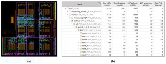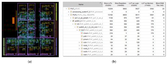 Test system for statistical characterization of the CRO-based PUF/TRNG: (a) Distribution of 10 instances of the IP on the programmable logic of the SoC device. (b) Resource consumption of the test system and the different components of the IP module.