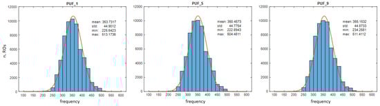 The results obtained by analyzing the behavior of all the configurations of each of the 240 CROs contained in the 10 IPs instantiated in the test system show that oscillation frequencies depend on both the location of the ROs and the configuration used. It can be seen that the oscillation frequencies present a normal distribution centered around 350 MHz and with a standard deviation of about 45 MHz. As an example, Figure 10 shows the histograms of the oscillation frequencies of the ROs for three of the IPs included in the test system. To obtain maximum precision in the measurements, the tests have been carried out in this occasion using the 15-bit counters of a test system implemented expressly for this purpose. However, as was logically expected, the values obtained by repeating the tests in test systems that use 10-, 12-, and 14-bit counters do not present significant variations.