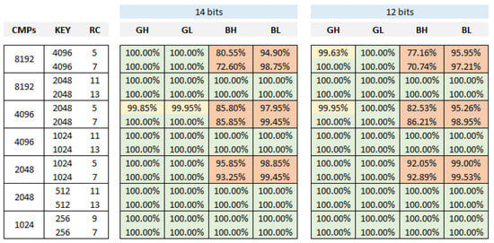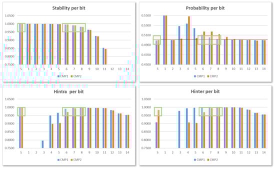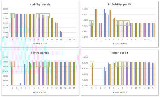These data allow us to corroborate the conclusions obtained in the previous works to maintain the bit selection criterion used in them. As the green boxes in the graphics point out, for PUF functionality, the most suitable bits to construct the output correspond to two of the bits 6–8, for comparisons between ROs implemented in LUTs placed in different CLB locations (COMP1), and the sign bit plus one of bits 7–8 in the other case (COMP2). In relation to functionality as TRNG, on the other hand, the two LSBs of the counters are the ones that provide the most appropriate probability and entropy values.