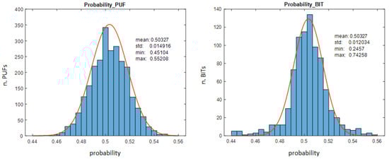 For PUF functionality, application allows us to statistically analyze the results of the different IP modules in a test system, based on the data obtained when invoking them () or after an enrollment process (), with the objective of determining the probability of occurrence of 0 s and 1 s at the outputs of the different samples () and in the positions corresponding to the different bits (). The histogram on the left of Figure 12 shows the probability that the output bits of each of the samples take the value ‘1’, while the one on the right illustrates the probability that each of the 960 output bits (four for each RO comparison) takes the value ‘1’ for all 2560 samples.
