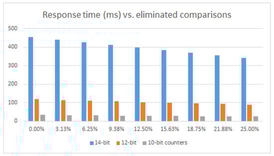 Figure 11 shows the results corresponding to invoking one hundred consecutive times each of the 10 IP instances in the test system that uses 14-bit counters, performing the maximum number of comparisons, and using the 256 possible configurations of the ROs to obtain data equivalent to 2560 PUF/TRNG samples with 960-bit outputs. The different metrics follow a behavior similar to that described in [28]: (1) stability values decrease in the direction from MSB to LSB, whereas the Hintra values grow in the same direction; (2) Hinter for the sign bit only reaches an acceptably high value in the second of the comparisons; and (3) probability values of the least significant bits are close to the ideal value of 0.5.
